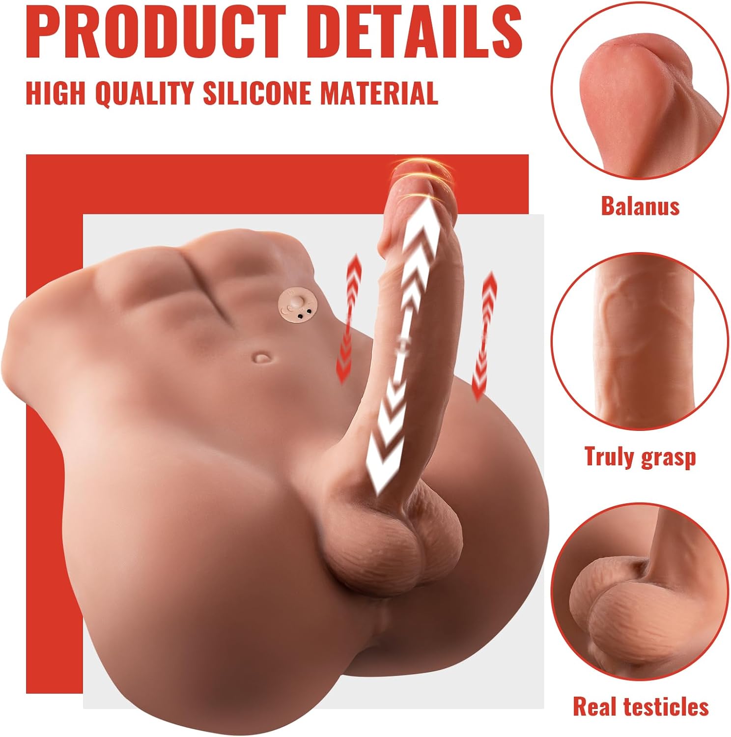 This torso offers two ways to play: a 6.7-inch erect dildo for riding and a textured 3D anal channel for penetration. The TPR material captures every detail, from the veins on the shaft to the tightness of the sphincter.